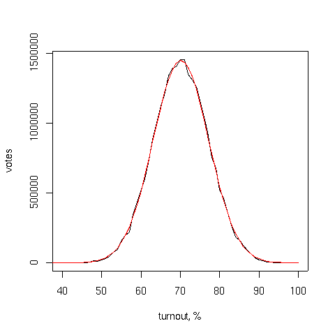 Для того щоб перевірити, чи немає тут явного проколу, я зробив модель голосування на виборах (використовував R). Взяв реальні дані по розміру всіх дільниць (~33 000 штук), і випадковим чином призначив на них явку, яку вибирав згідно нормального розподілу з параметрами, що близькі до тих, які були на останніх виборах. А саме, з середньою явкою що дорівнює 70%, та з її стандартним відхиленням у 7%.
