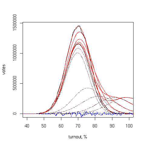 Далі, графік для суми голосів по всім дільницям з однаковою явкою - теж гаусіан. Це друге твердження вимагає, чесно кажучи, доказу - однак приймемо його на віру, тому що знов таки, в реальних даних спостерігається саме така картина. (теж див. наприклад, Мал. 2 тут)