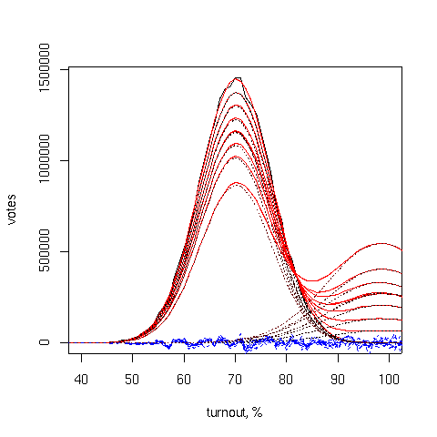 На графіках - результати такого моделювання "виборів з порушеннями". На перший картинці намальовано, як утворюється другий горб, що відповідає за "підозрілі" дільниці (той горб, що правіше) , за умов коли міняється кількість "підозрілих" дільниць, з штучним збільшенням явки. Гаусіани для двох типів дільниць (чесних і підозрілих)намальовані пунктиром, а їх сума, тобто загальна картинка - суцільною лінією. (Пунктирні гаусіани також підбиралися методом найменших квадратів)