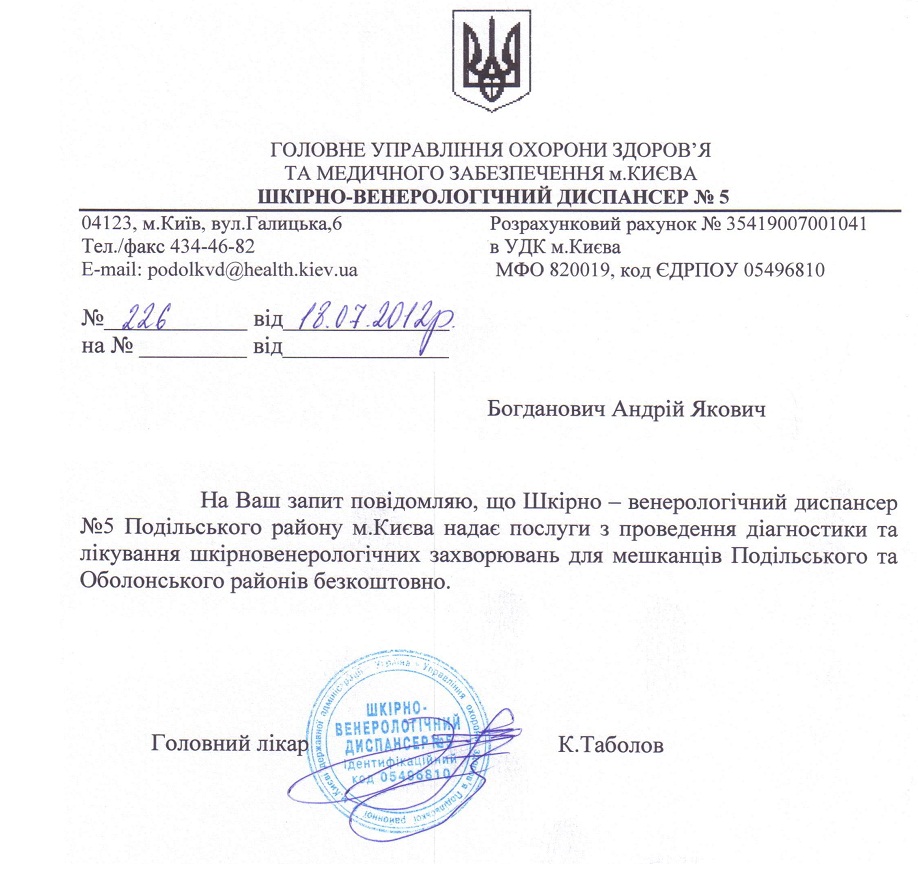 До мене звернувся громадянин на прізвище П., один з пацієнтів Міжрайонного шкірно-венерологічного диспансеру № 5 Подільського району міста Києва, що знаходиться за адресою: вул. Галицька, 6 (далі – диспансер). Як повідомив П., адміністрацією диспансеру збираються гроші саме в зазначений вище спосіб. В принципі, все традиційно. Окрім того, ситуація підсилюється делікатністю захворювань пацієнтів цієї лікарні. Очевидно, що навіть маючи незгоду з таким вимаганням грошей, громадяни, хворі на венеричні недуги, навряд чи підуть скаржитись до міської адміністрації.