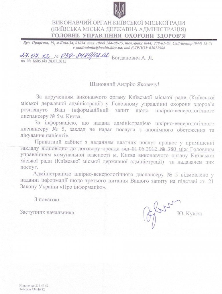 У відповідь прийшов лист, в якому говорилося, що послуг з анонімного обстеження та лікування диспансер не надає, а от у наданні інформації щодо орендаря було відмовлено, копії договору оренди не було надано.