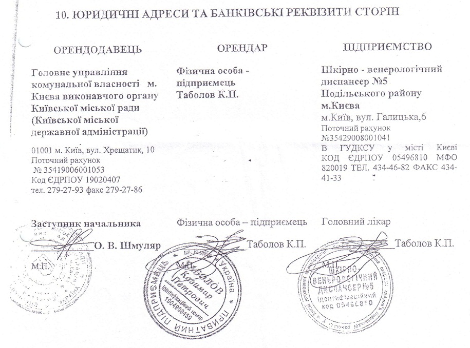 Цікаво, що договір оренди, окрім заступника начальника Головного управління комунальної власності міста Києва, підписав двічі ТАБОЛОВ Казимір Петрович: один раз – як фізична особа-підприємець, а другий – як головний лікар диспансеру.