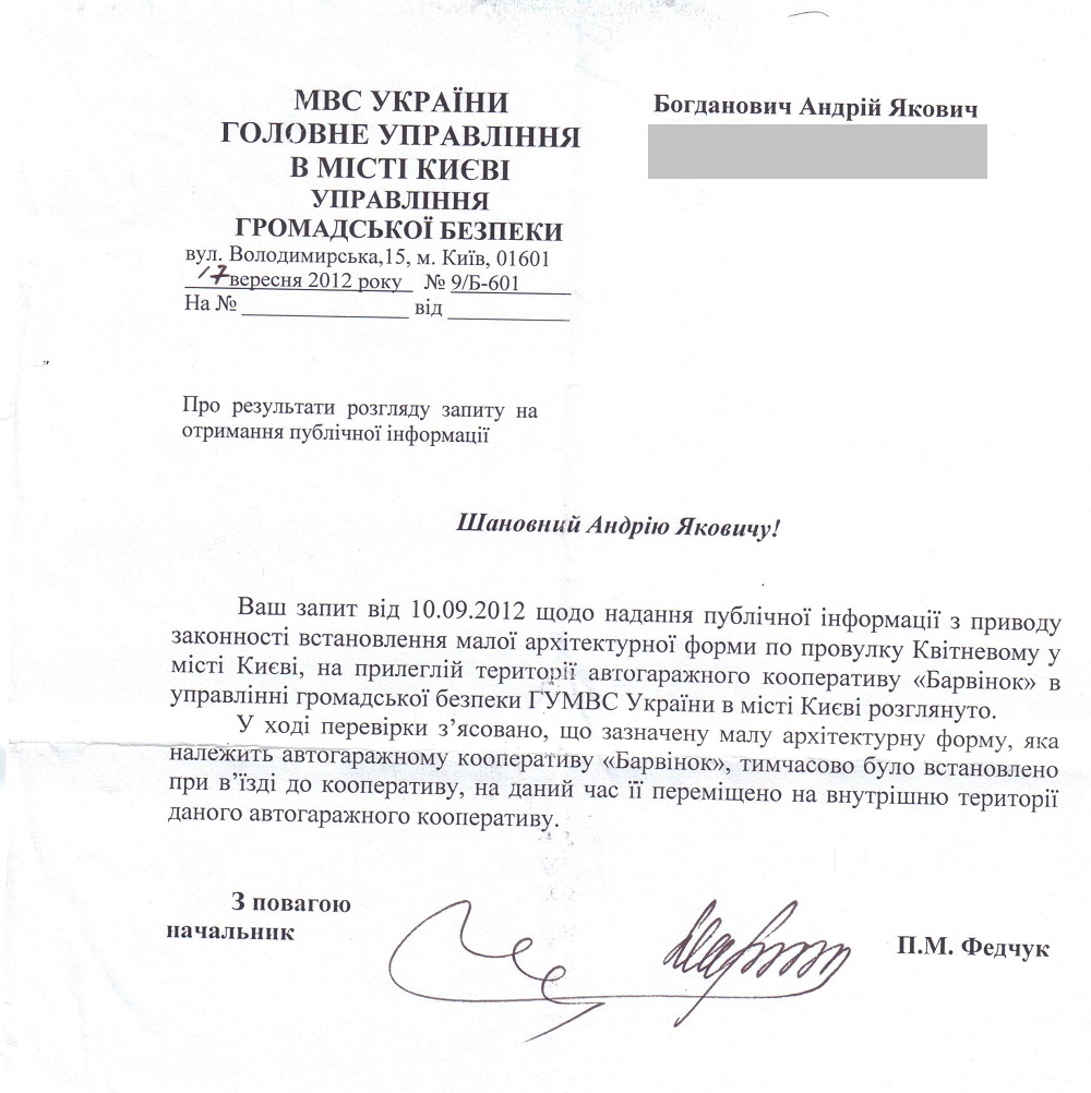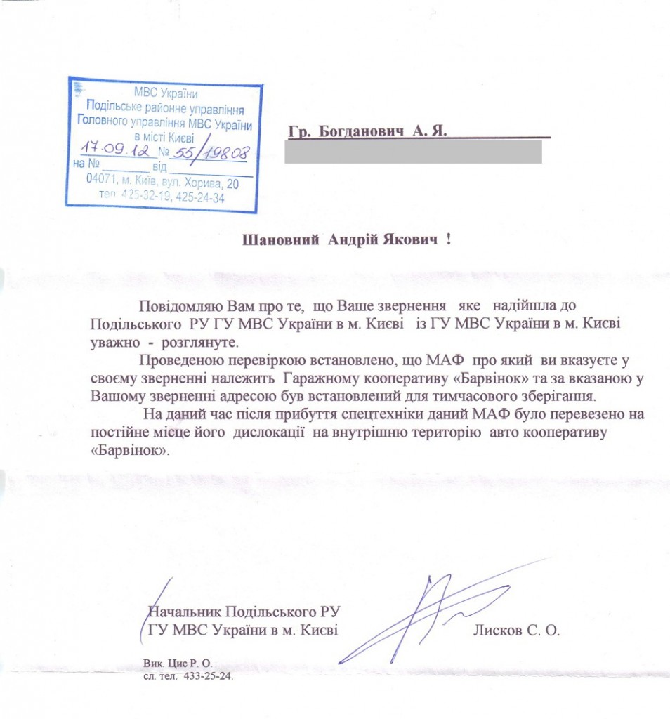 В четвер мені зателефонував наш дільничний та попросив прийти до нього, щоб написати пояснення. Це я і зробив. Дільничний пообіцяв, що МАФ демонтують, саме для цього моє пояснення і треба. В неділю, вагончика вже не було, а ще через пару днів мені прийшло аж по дві відповіді аналогічного змісту на кажен з моїх запитів, скани яких публікую нижче.