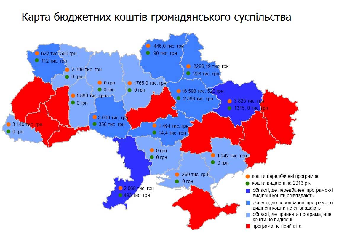 Однак, подальше співставлення програм і реально передбачених коштів на 2013 рік показує сумну тенденцію. Тільки 8 областей передбачили в своїх бюджетах кошти для громадянського суспільства на 2013 рік. З них тільки 2 області передбачили суму, яка була закладена в програмі. При детальному аналізі ми отримаємо майже 35% виконання, за які нещодавно Віктор Янукович критикував уряд у здійсненні реформ. Саботаж?