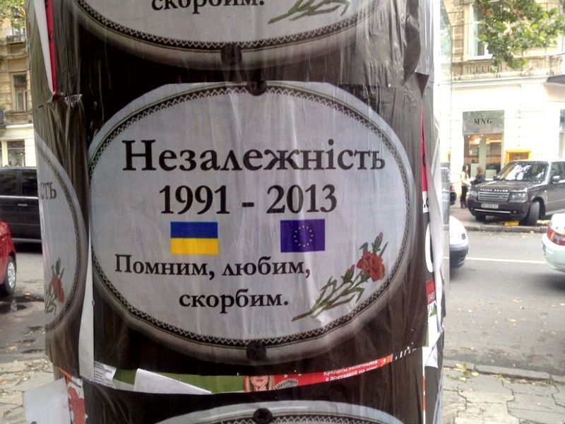У ніч на 15 вересня центр Одеси заполонили численні чорні, як гранітний цвинтарний пам’ятник, плакати, на яких зображено меморіальну плиту з написом: «Незалежність 1991-2013. Пам’ятаємо, любимо, уболіваємо». Під таким нібито скорботним надмогильним пам’ятником українофоби поспішають поховати незалежну соборну Україну. Вбивцею її вони називають Європейський Союз, прапор якого намальовано поруч із датою ймовірної кончини нашої незалежності.