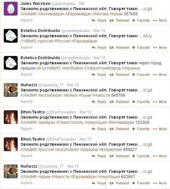 Боти-дезінформатори. Найбільш шкідливі. Можуть розмущувати застаріли новини – скажімо, на початку березня можна зустріти повідомлення про штурм АП, скупчення силовиків на Грушевського тощо. Активно розповсюджують чутки – про переміщення загонів тітушок, російські танки тощо.
