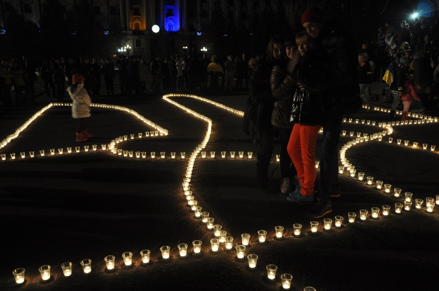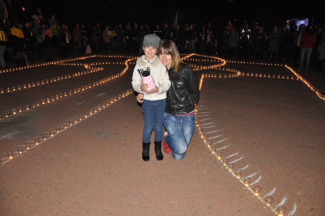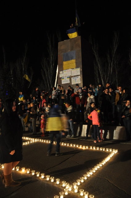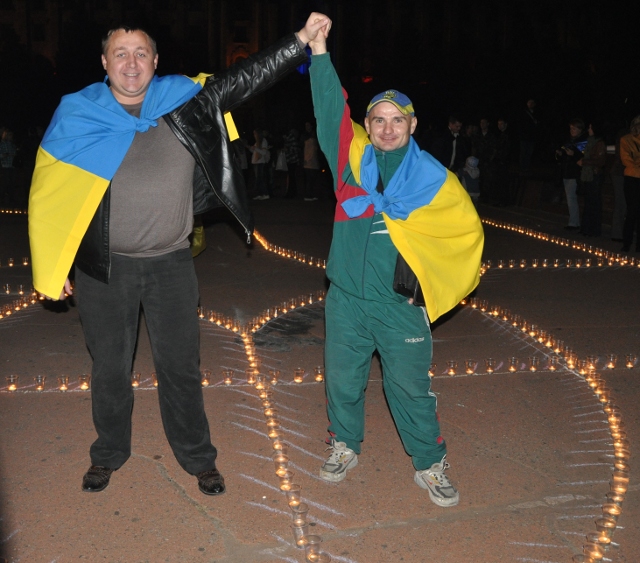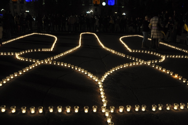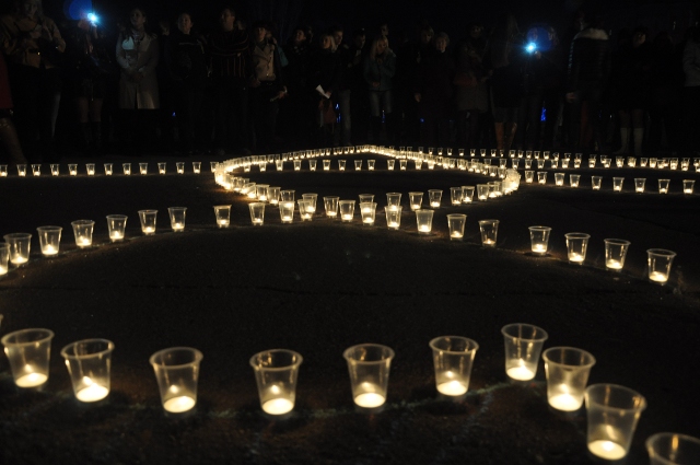 Во время акции люди выложили на асфальте большой герб Украины из зажжённых свечей в знак очищения и объединения с живыми и погибшими воинами АТО.