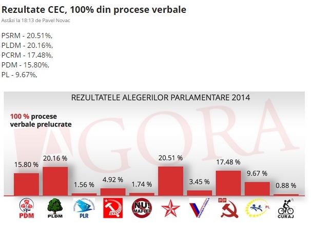 Слід додати, що ще дві проросійські сили "комуністи-реформатори" та "Вибір Молдови - таможенний союз" набрали 4,9% та 3,45% відповідно. Й у підсумку відтягнули частину голосів на себе та не дали соціалістам й комуністам набрали більше.
