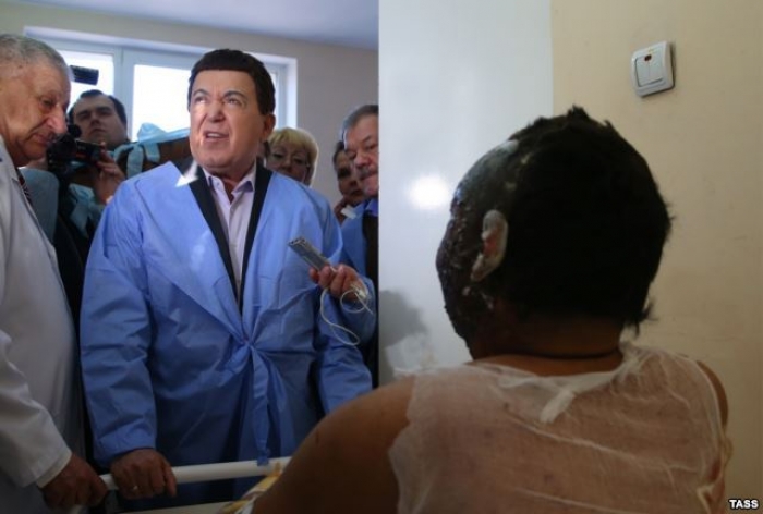 23 февраля 2015 года находясь в городе Донецке Кобзон посещает больницу и разговаривает с раненым бурятом, танкистом, воевавшим против Украины.