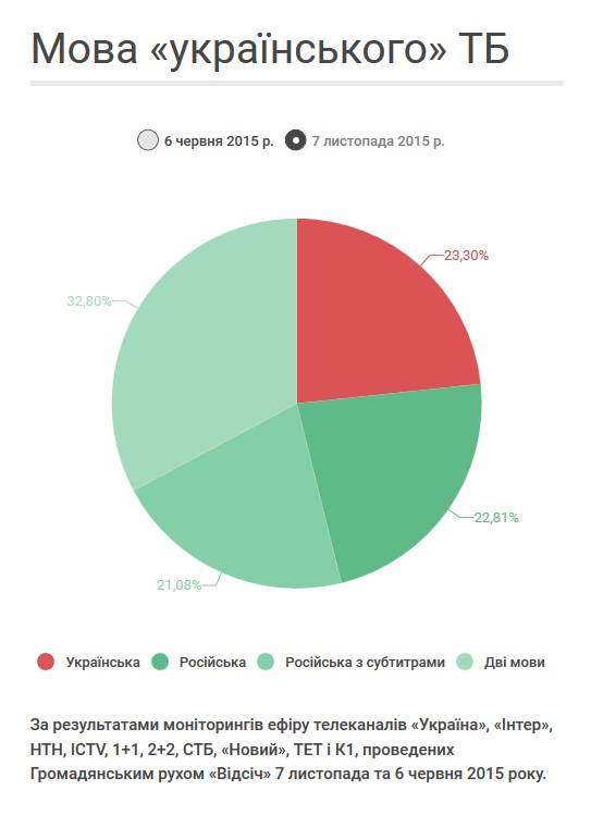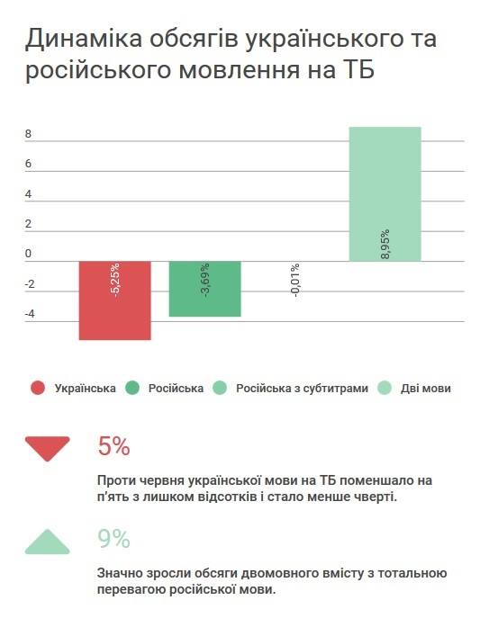 Збільшення обсягів українського та зменшення обсягів російського вмісту на ТБ пов’язане з громадським тиском на телеканали та з дією закону про захист інформаційного простору, який набув чинності на початку червня. Однак, українські телеканали та студії, що виробляють фільми й передачі, замість збільшити обсяги україномовної продукції, свідомо зменшують їх, накидаючи глядачам «українські» фільми про Росію, для Росії й російською мовою, а також сумнівної якості телешоу, де українською говорить лише один з багатьох ведучих або тільки голос за кадром. Обсяги двомовної продукції з тотальним домінуванням російської мови збільшилися за п’ять місяців на 9%.