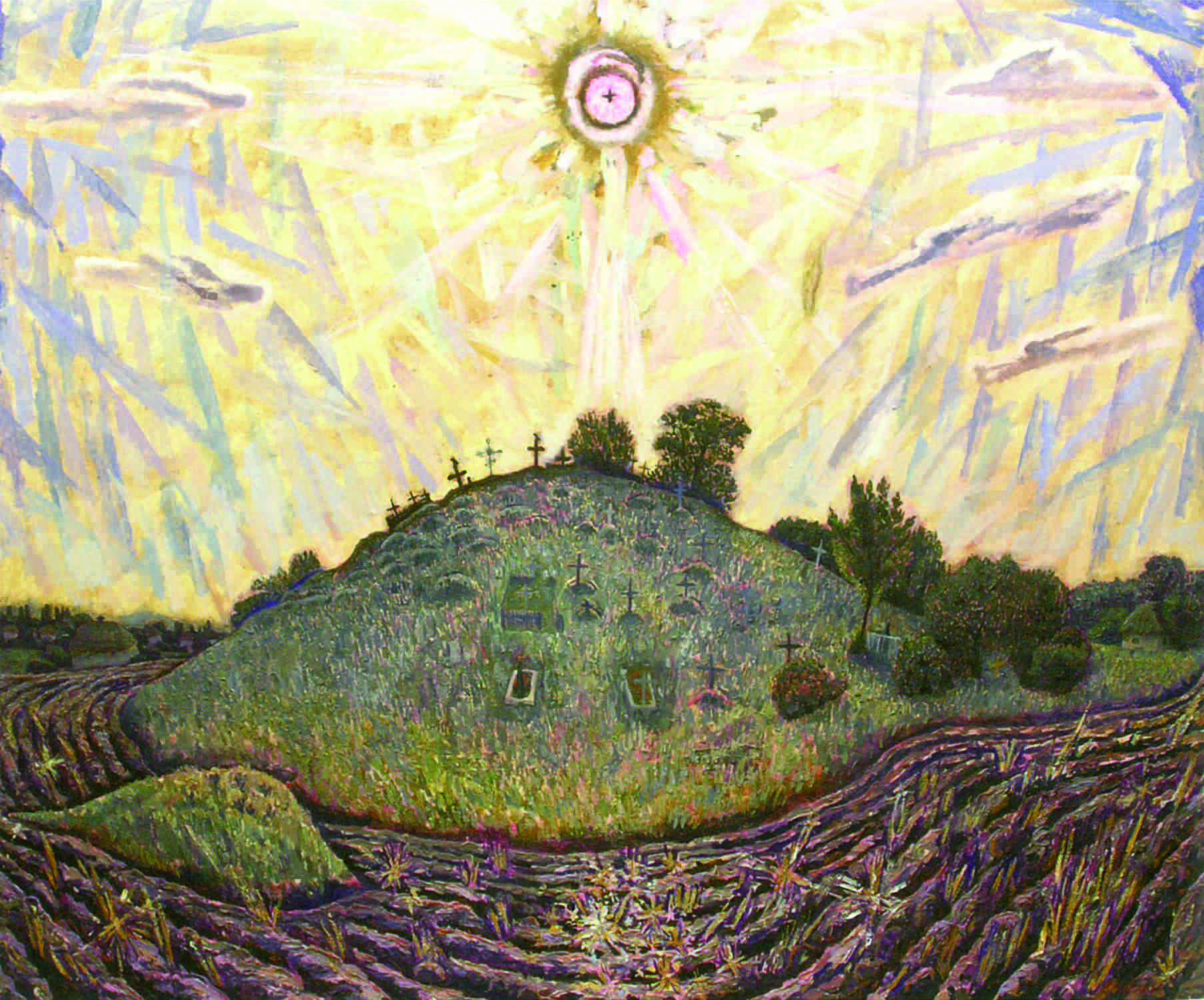 Ще одна грань творчості січеславського живописця – це картини, де зображено втрачений світ української Атлантиди, що проходить перед нашим внутрішнім зором, подібно до підземної ріки у закамарках свідомості. Спинім свою увагу на картині «Земля предків» (1982 рік). У горішній частині – тьмяне сонце, від нього в усі боки по небу розходяться тривожні жовто – блакитні «сигнали» про якесь дійство, в центрі – пагорб, на якому поховання давніх віків, той пагорб, наче острів, довкола котрого зораний чорнозем. То ознака, свідчення зародження і розвитку однієї з найстаріших цивілізацій, цивілізації осілого народу – хліборобів, поетів, мислителів…