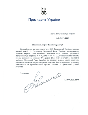 Президент України скликає 30 вересня позачергове засідання Верховної Ради для ухвалення невідкладних рішень в судовій реформі, а саме - ля звільнення за порушення присяги усіх суддів, щодо яких внесено подання Вищою радою юстиції, в тому числі тих, які причетні до незаконних арештів майданцівців.