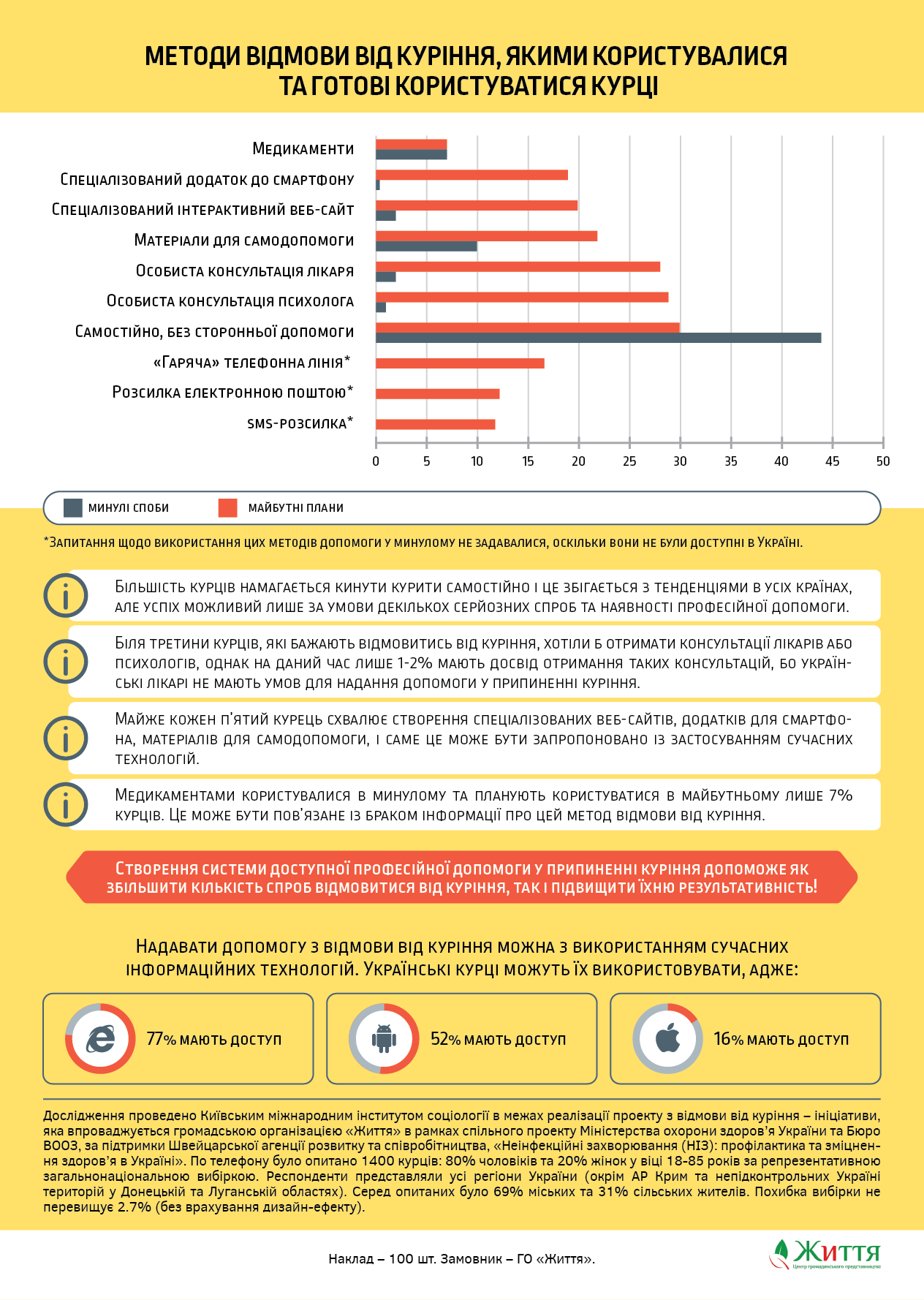 За результатами загальноукраїнського опитування курців, проведеного Київським міжнародним інститутом соціології у вересні-жовтні цього року, в Україні існує значна потреба у сервісі з надання професійної допомоги у припиненні куріння: