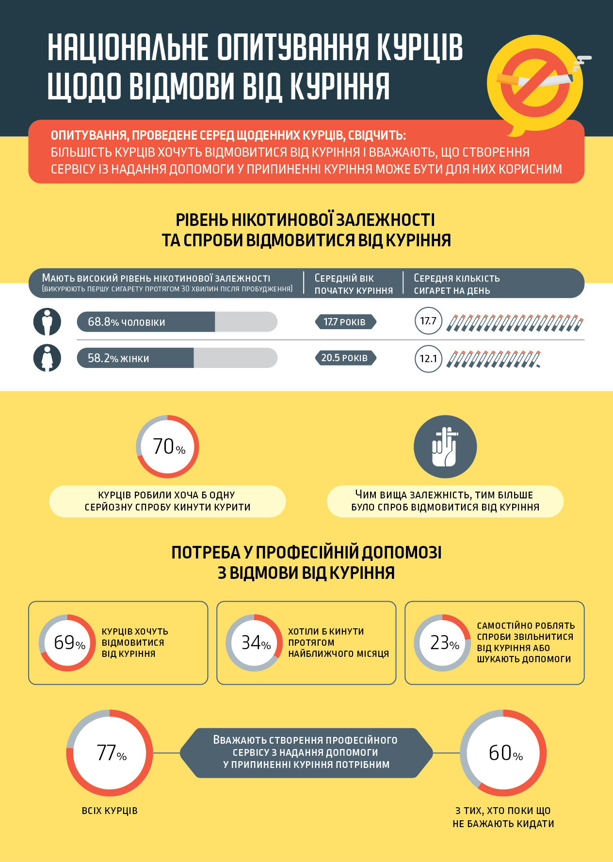 В той же час 69% опитаних курців висловили бажання кинути курити, 70% респондентів-курців вже робили принаймні одну спробу.