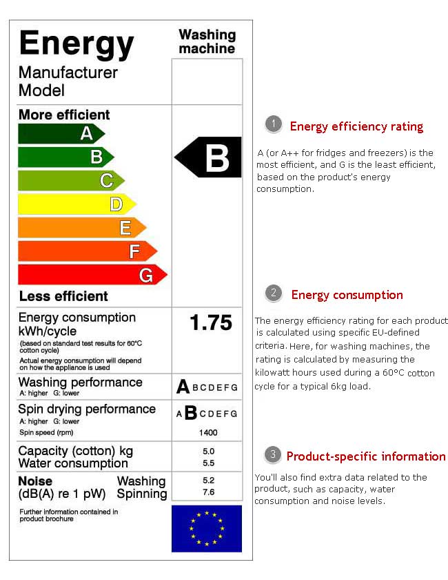 Так, кожен вид побутового приладу вимірюється класом енергоефективності (від А+++ до D) на основі так званого «індексу енергоефективності», що показує різницю між фактичним енергоспоживанням побутового приладу та певним «стандартним» рівнем енергоспоживання, яким задається нижня межа «найгіршого рівня енергоспоживання». Також встановлюються вимоги щодо макету етикетки, яка має обов′язково бути на приладі, інформації, що має на ній розміщуватися, вимоги до оформлення тощо.