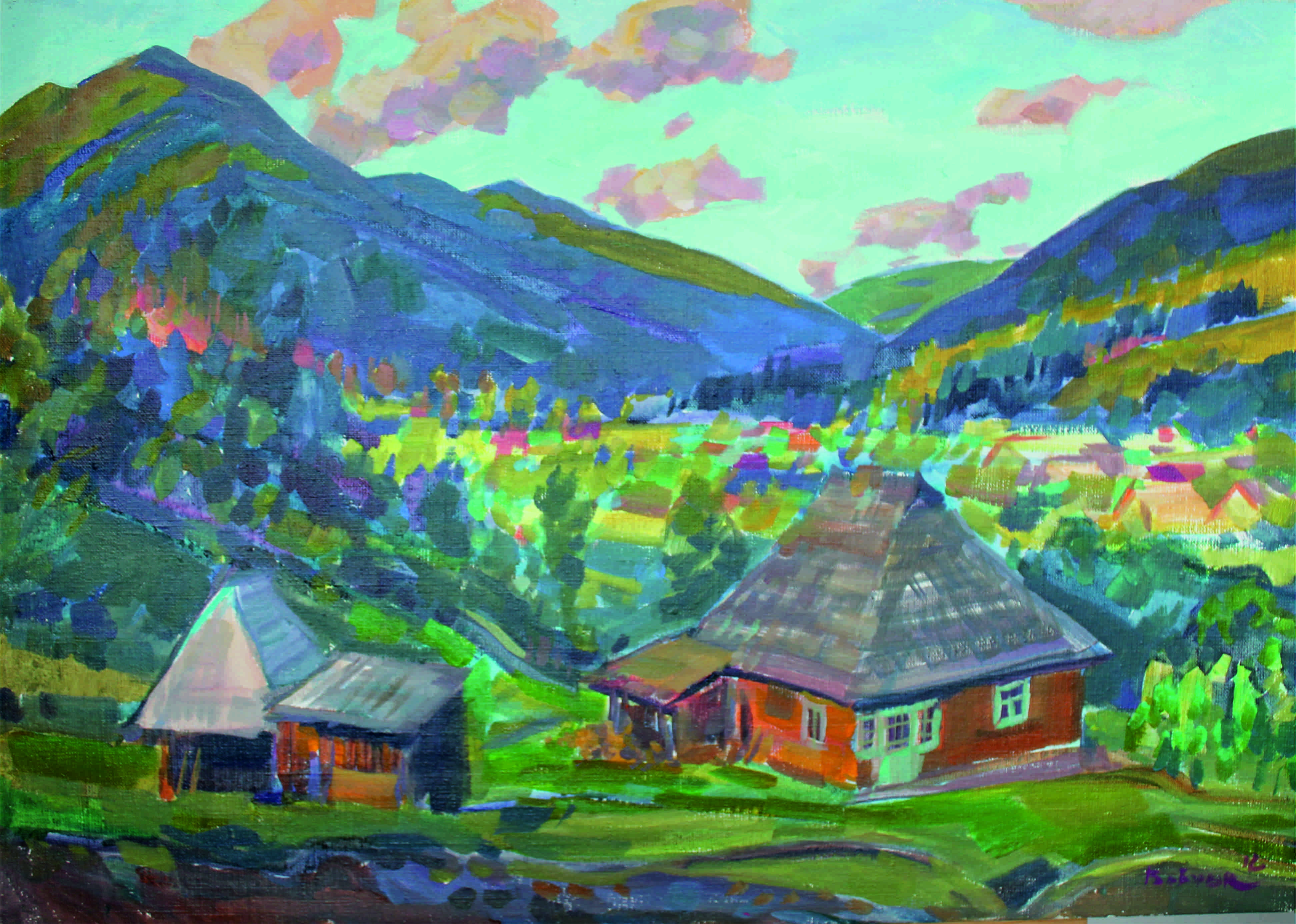 Погляньмо на роботу митця – «Ранок у Карпатах»… Усе, що може охопити око прокидається, - гори заліснені, хатинки, хмарки жвавіше рухаються по небу, його величність Ранок вступив у свої права. Чарівні закутки Срібної Землі… Поетка відгукується таким мотивом: