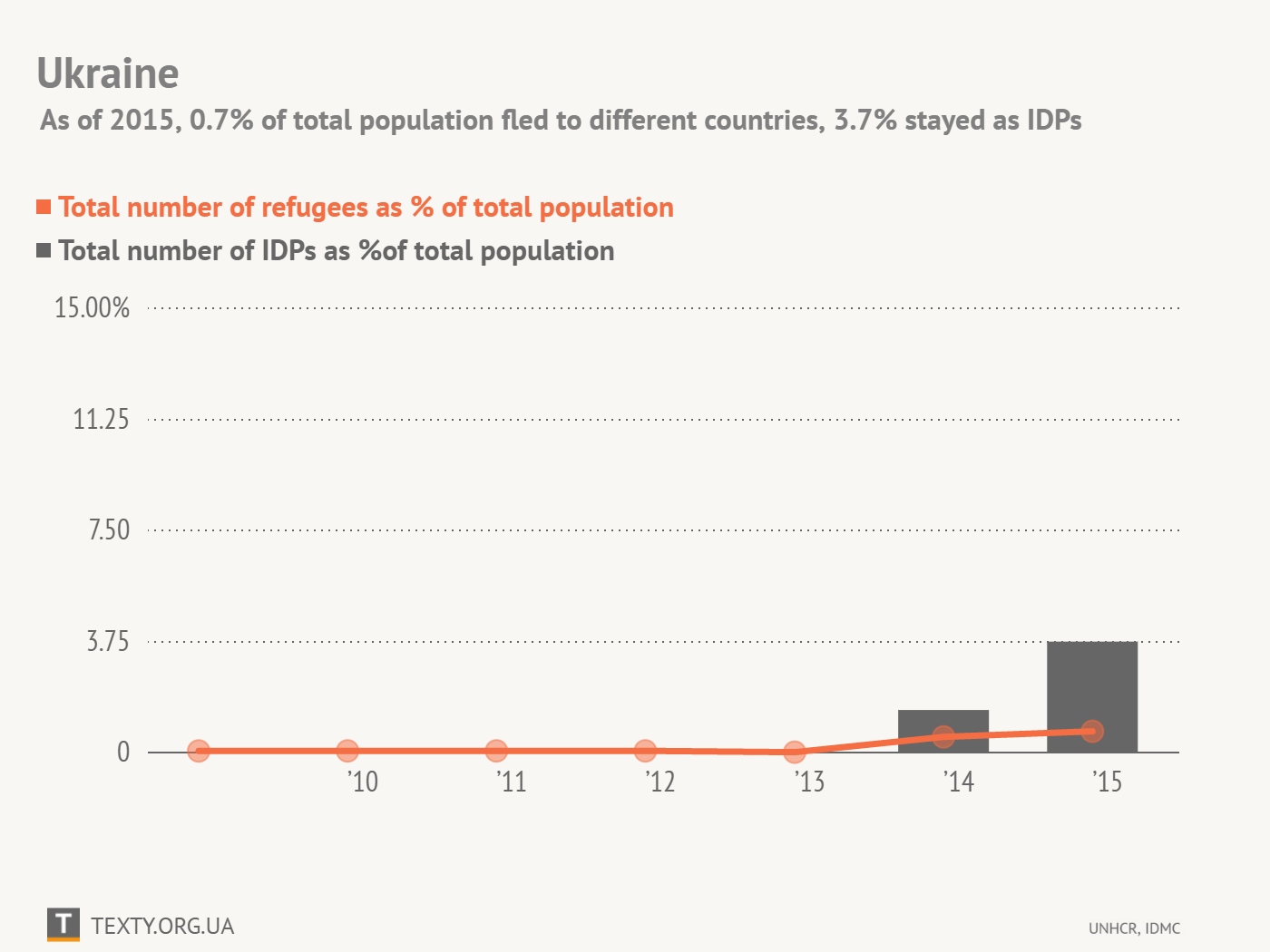 Due to the conflict in Donbas and annexation of the Crimea starting from the 2014 Ukraine was submitted into the list of the leading countries as to the number of the forcibly displaced people. According to the data provided by IDMC since December 2015, Ukraine has occupied the 8th place in the world’s list right after South Sudan, Nigeria and Yemen.