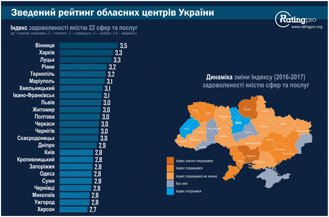 Більше детальний рейтинг організувала соціологічна група "Рейтинг" від імені Міжнародного республіканського інституту. У зведеному рейтингу серед обласних центрів Запоріжжя знаходиться на восьмій позиції з кінця в Індексі задоволеності якістю сфер та послуг. Сюди входять медицина, водопостачання, освітлення, дороги тощо.
