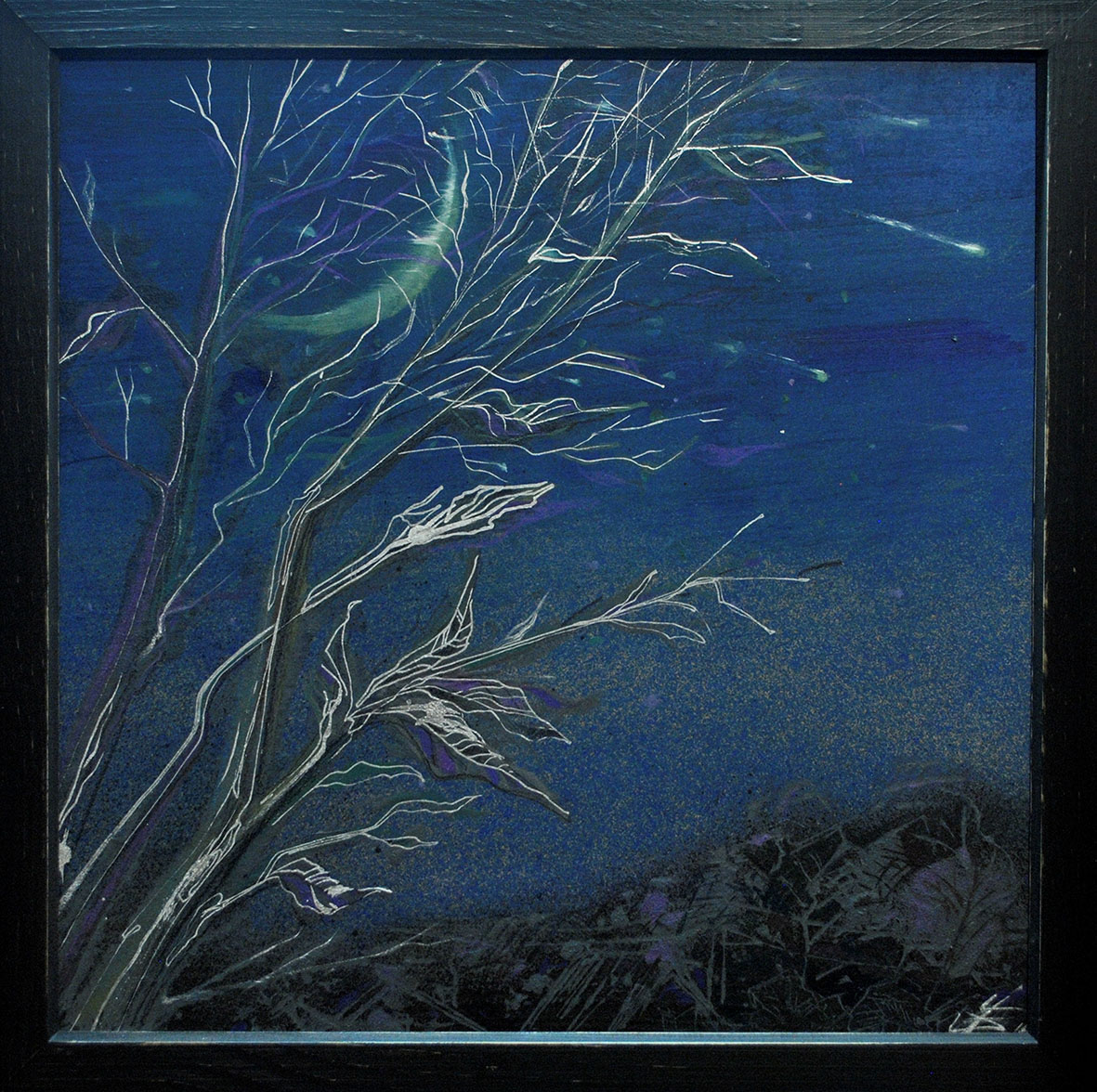 Картина окреслена не широким чорним квадратом рамці, дається розуміння…, ні, радше запрошення в ніч. Тло роботи аж надто не одноколірне, згори переважають чорнуваті, темно- темно сині відтінки, з переходами до звично синього кольору, опускаєш погляд трохи додолу, а там – небо всіяне, помережане тоненькими крапочками – зернинками, може то ніжна небесна заметіль, бо вітерець повіває, заметіль досягає землі, і вже уподібнюється до сизого туманця … А земля чорнюща, полтавський чорнозем. На ньому штрихами – знаками зображено те, що росте на цій землі, чи то росло колись.