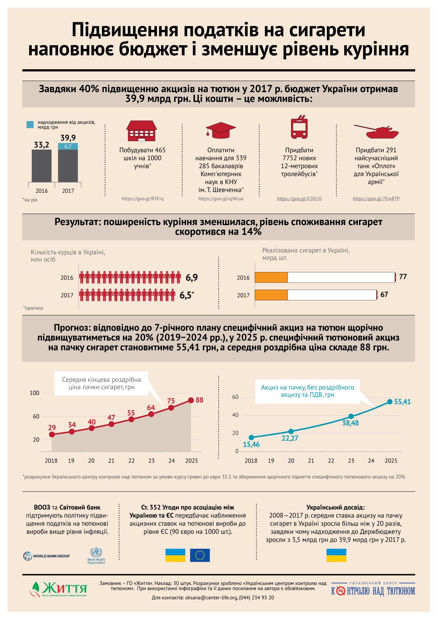 Україна має позитивний досвід попередніх років підвищення податків на тютюнові вироби, що сприяло не лише збільшенню надходжень до бюджету, але й зменшенню поширеності куріння. У 2008—2017 роках середня ставка акцизу на пачку сигарет в Україні зросла більш ніж у 20 разів, завдяки чому надходження до Держбюджету зросли з 3,5 млрд грн до майже 40 млрд грн у 2017 р. Глобальне дослідження поширеності куріння в Україні, проведене у 2017 році, показало зменшення поширеності куріння на 20% серед дорослого населення за останні 7 років.