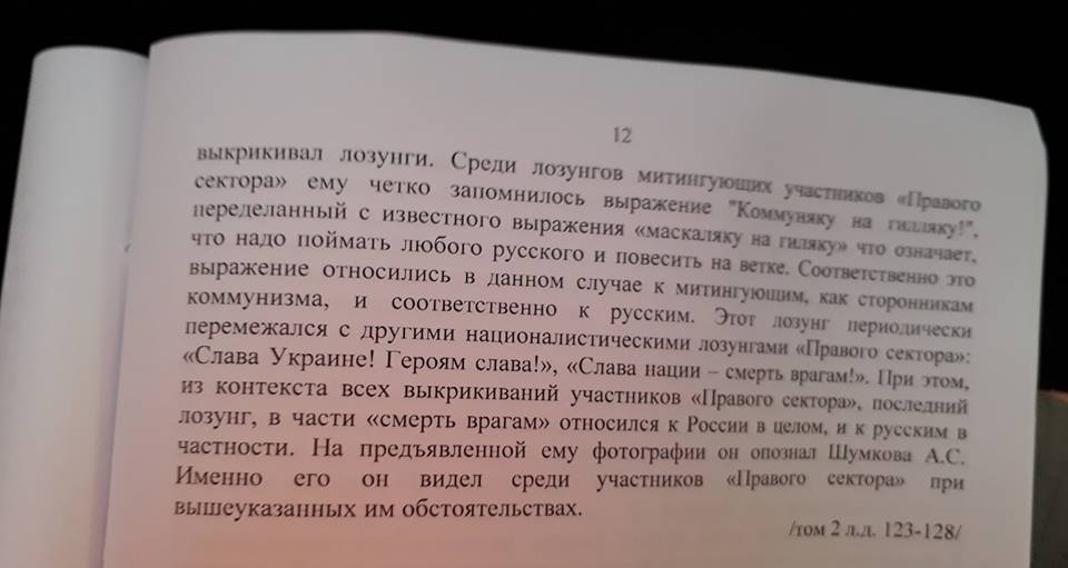 "Среди лозунгов митингующих участников «Правого сектора» ему четко запомнилось выражение «Коммуняку на гилляку!», переделанный с известного выражения «маскаляку на гилляку», что означает, что надо поймать любого русского и повесить на ветке.Соответственно это выражение относилось в данном случае к митингующим, как сторонникам коммунизма, и соответственно к русским. Этот лозунг периодически перемежался с другими националистическими лозунгами Правого сектора: Слава Украине! Героям Слава! Слава нации - Смерть врагам! При этом из контекста всех выкрикиваний участником Правого сектора последнйи лозунг, в частности «смерть врагам» относится к России в целом, и к русским в частности. На предъявленной ему фотографии он опознал Шумкова А.С. Именно его он видел среди участников Правого сектора при вышеуказанных им обстоятельствах.».