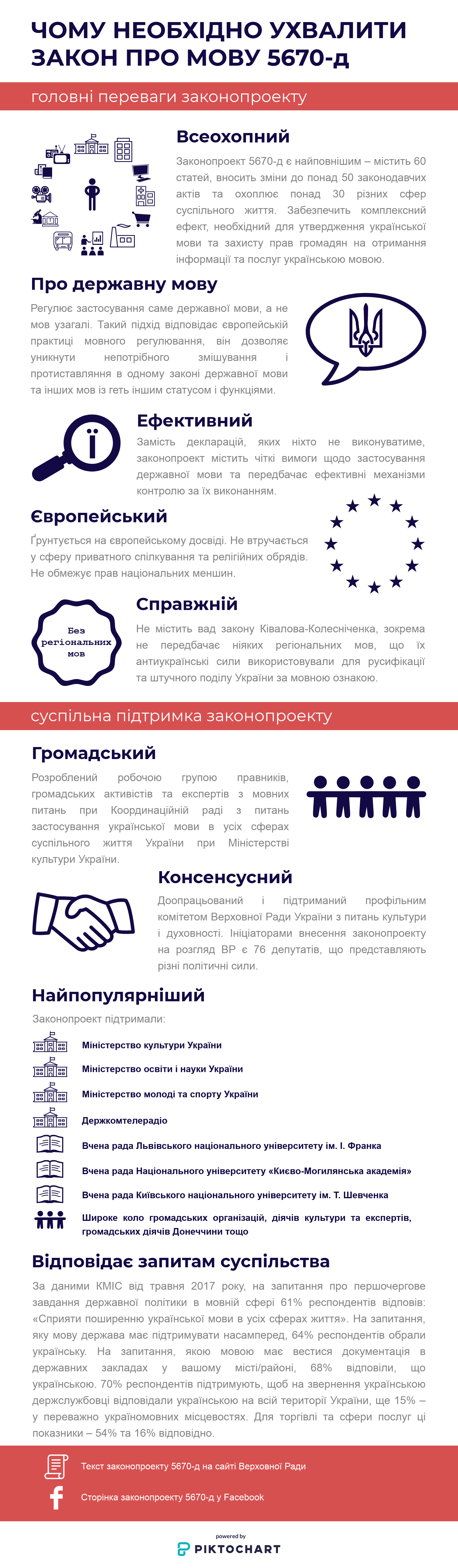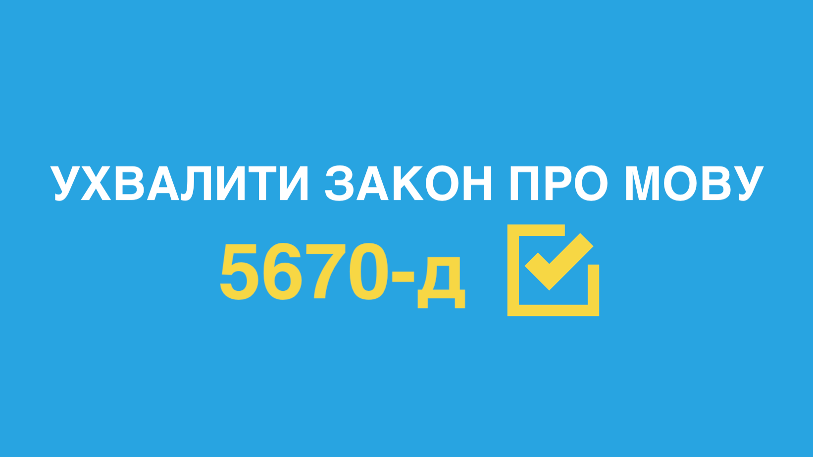 Закону про державну мову Україна чекала 27 років незалежності. Ситуація дійшла до абсурду, адже питання мови багато років регулювалося радянським законом 1989 року. Пізніше працював сумнозвісний закон Ківалова-Колєсніченка, який скасував Конституційний суд України у 2018 році. Законопроект Про державну мову, який зареєстрований під номером №5670-д, буде винесено на голосування у Верховній Раді у першому читанні 4 жовтня. Він напрацьований робочою групою правників, громадських активістів та експертів Координаційної ради з питань застосування української мови в усіх сферах суспільного життя України при Міністерстві культури України, а також враховує важливі позиції інших законопроектів на цю тему. Законопроект детально розписує вживання української мови як державної у всіх публічних сферах і законодавчо утверджує її позиції як державної. Що важливо, законопроект 5670-д запроваджує механізми, які дозволятимуть забезпечувати виконання закону. Окрім цього, законопроект 5670-д має найширшу громадську, експертну та політичну підтримку. Ініціаторами внесення проекту 5670-д є профільний комітет Верховної Ради і 76 депутатів, що представляють різні політичні сили. Законопроект підтримали, зокрема, Міністерство культури України, Міністерство освіти і науки України, Міністерство Молоді та спорту України, Держкомтелерадіо, Вчена рада Львівського національного університету імені Івана Франка, Вчена рада Національного університету "Києво-Могилянська академія", Вчена рада Київського національного університету, широке коло громадських організацій, діячів культури та експертів, громадських діячів Донеччини тощо.