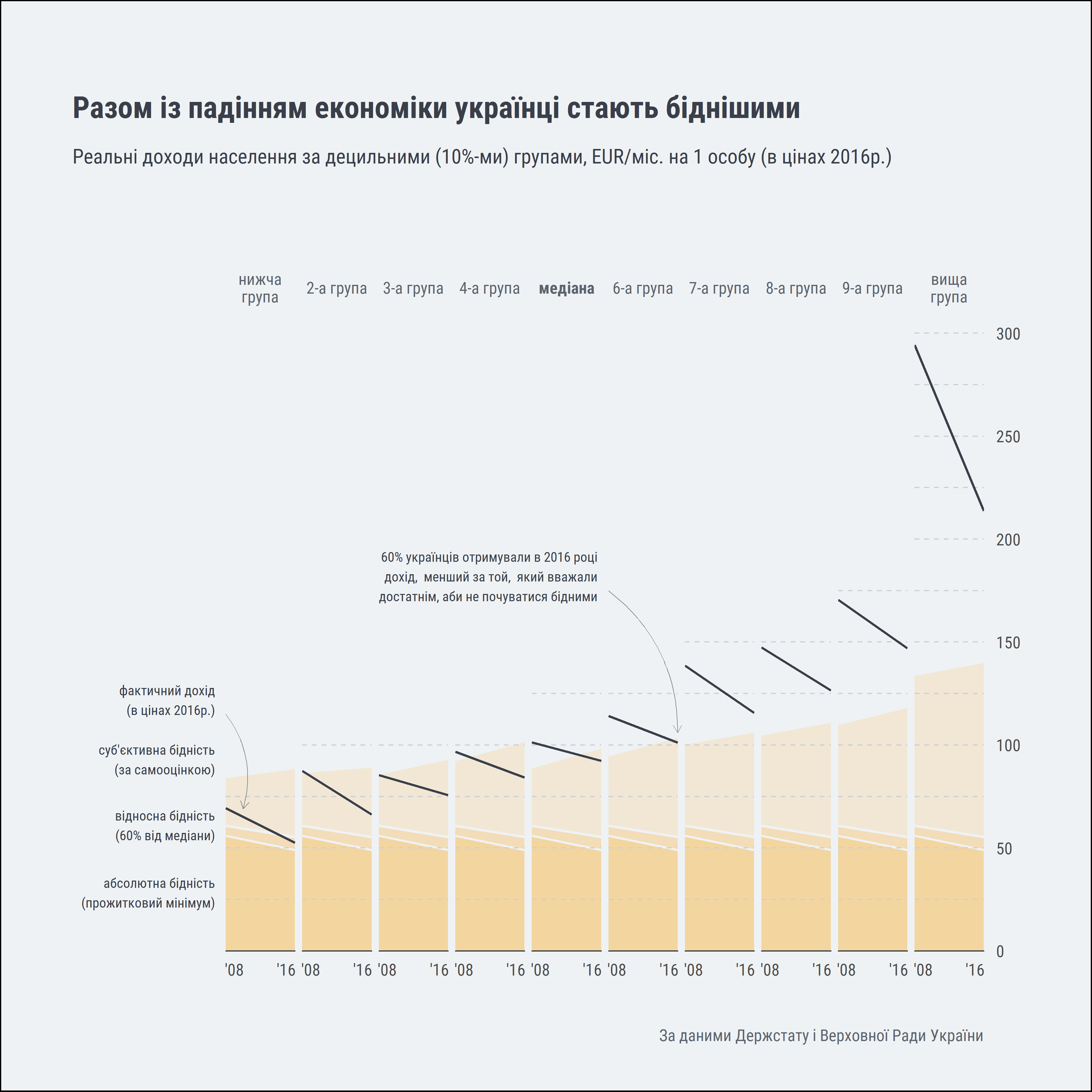 Економіка України падає протягом кількох останніх років. За період з 2008 по 2016 роки реальний ВВП на душу населення скоротився на третину, що зумовило значне погіршення добробуту українців. Боротьба із бідністю визнана державою однією із цілей сталого розвитку країни до 2030 року. Для планування видатків на соціальний захист уряд визначає рівень бідності за кількістю громадян із доходами, меншими за встановлений мінімум. Альтернативний підхід полягає у віднесенні до бідних тих людей, які вважають свої фінансові ресурси недостатніми для підтримання способу життя, що притаманний суспільству. Відтак, за різними оцінками бідність в Україні сягає від 10 до 60%. Ми з'ясували, що масштабна і тривала незадоволеність населення своїм матеріальним станом спотворює його мислення і соціальну поведінку, чим перешкоджає подальшому зростанню економіки України