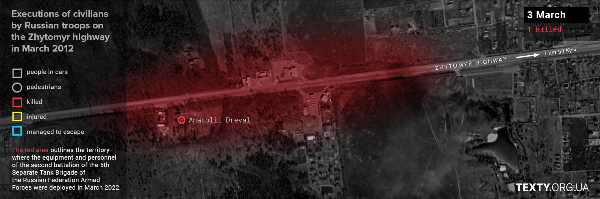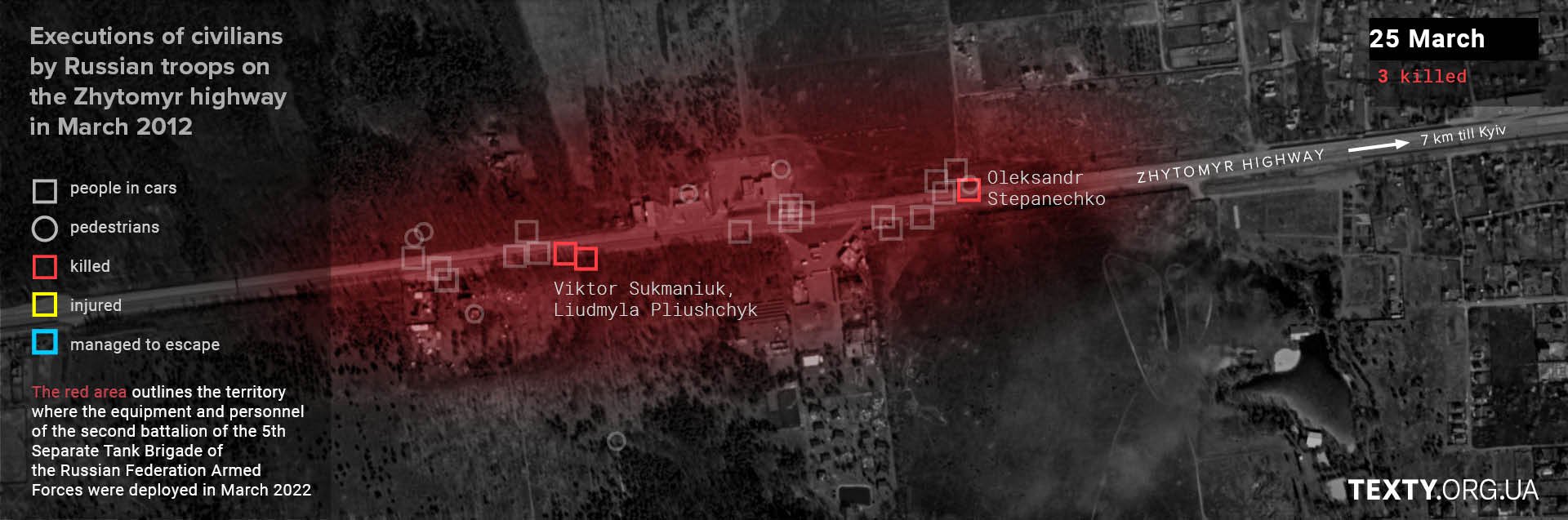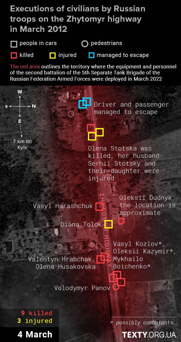 The actions of the 2nd Battalion of the 5th Separate Tank Brigade in the area around the UPG petrol station killed at least 27 people and injured five others. Other battalions of the 5th Brigade were further along the road; their positions stretched from the village of Buzova to almost Stoyanka, which is about 15 km away. And wherever they were stationed, there were killings and injuries: in the village of Buzova, civilian pedestrians were shot dead; in the village of Berezivka, a volunteer was shot dead... These and many-many other murders are still under investigation.
