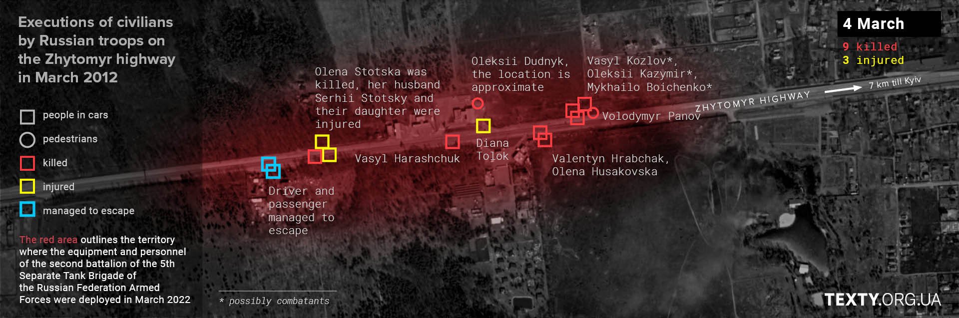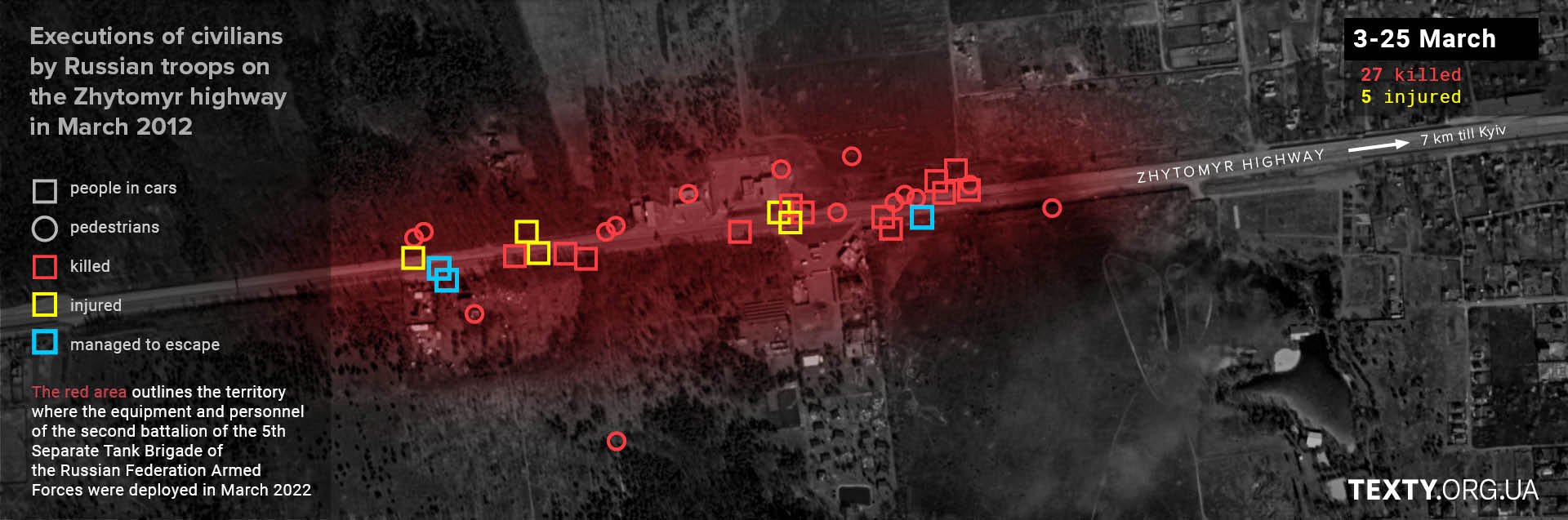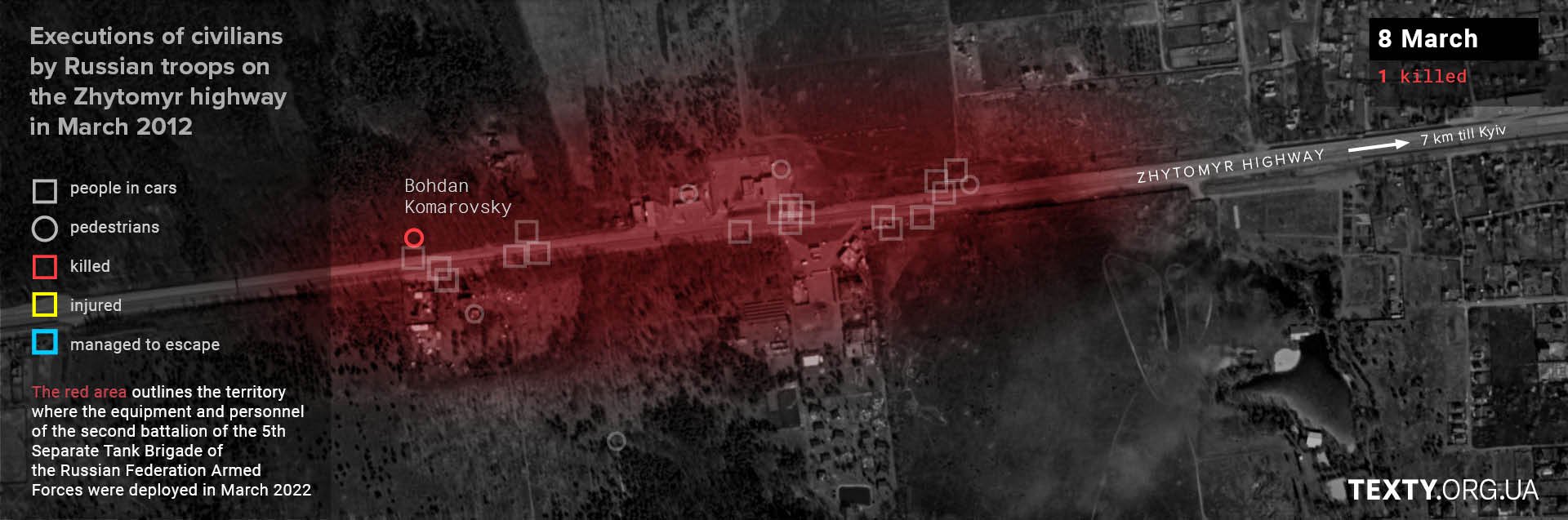 The actions of the 2nd Battalion of the 5th Separate Tank Brigade in the area around the UPG petrol station killed at least 27 people and injured five others. Other battalions of the 5th Brigade were further along the road; their positions stretched from the village of Buzova to almost Stoyanka, which is about 15 km away. And wherever they were stationed, there were killings and injuries: in the village of Buzova, civilian pedestrians were shot dead; in the village of Berezivka, a volunteer was shot dead... These and many-many other murders are still under investigation.