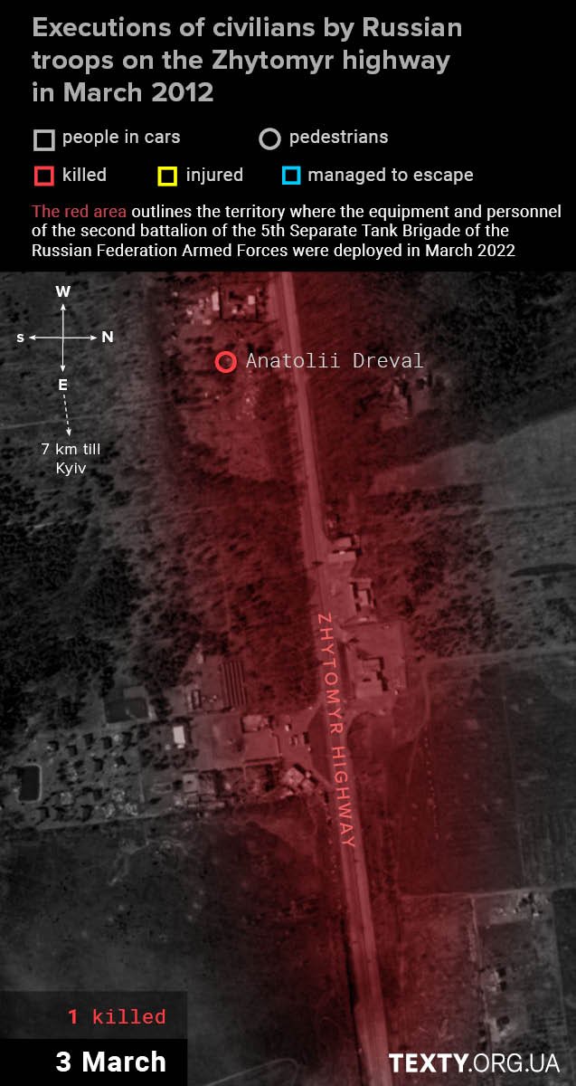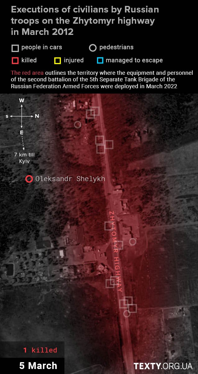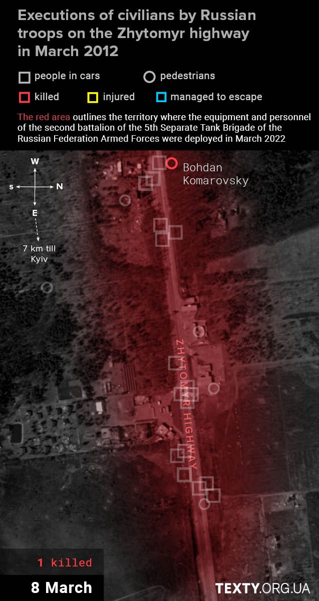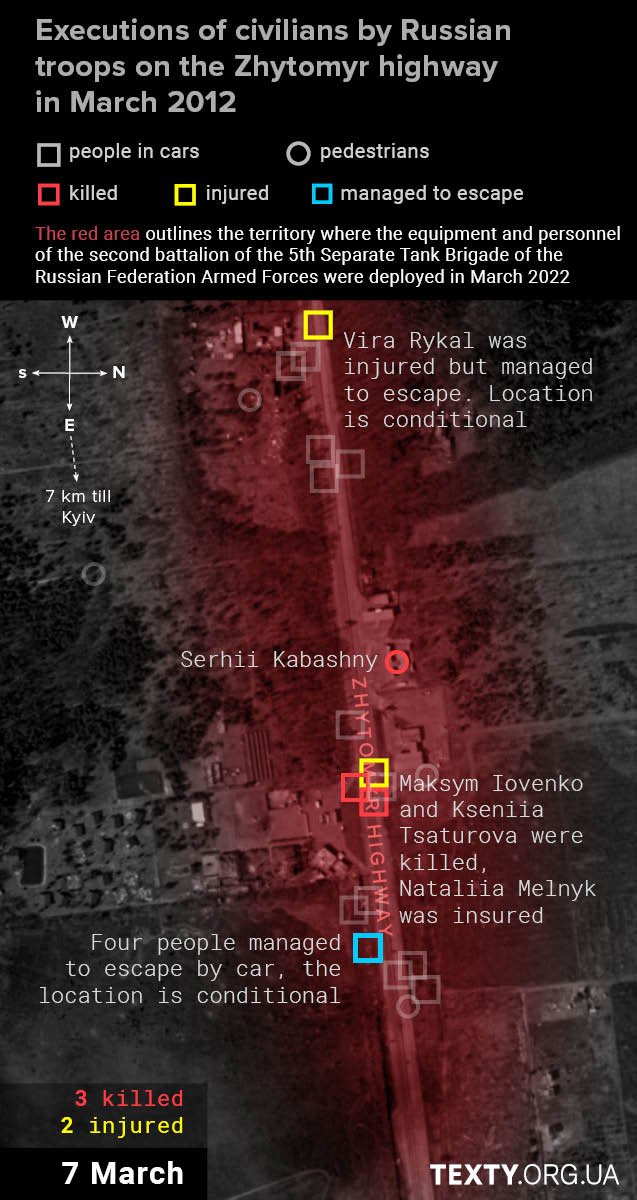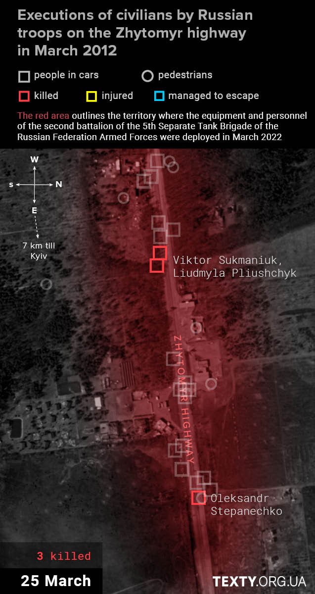 The shooting of this car will probably not be classified as a war crime, as there were combatants from the local territorial defence: Vasyl Kozlov, Oleksii Kazymir and Mykhailo Boichenko. Their checkpoint in the Stoyanka area was shelled, and the men decided to change their position and drove west along the Zhytomyr highway. All three were killed on the spot.