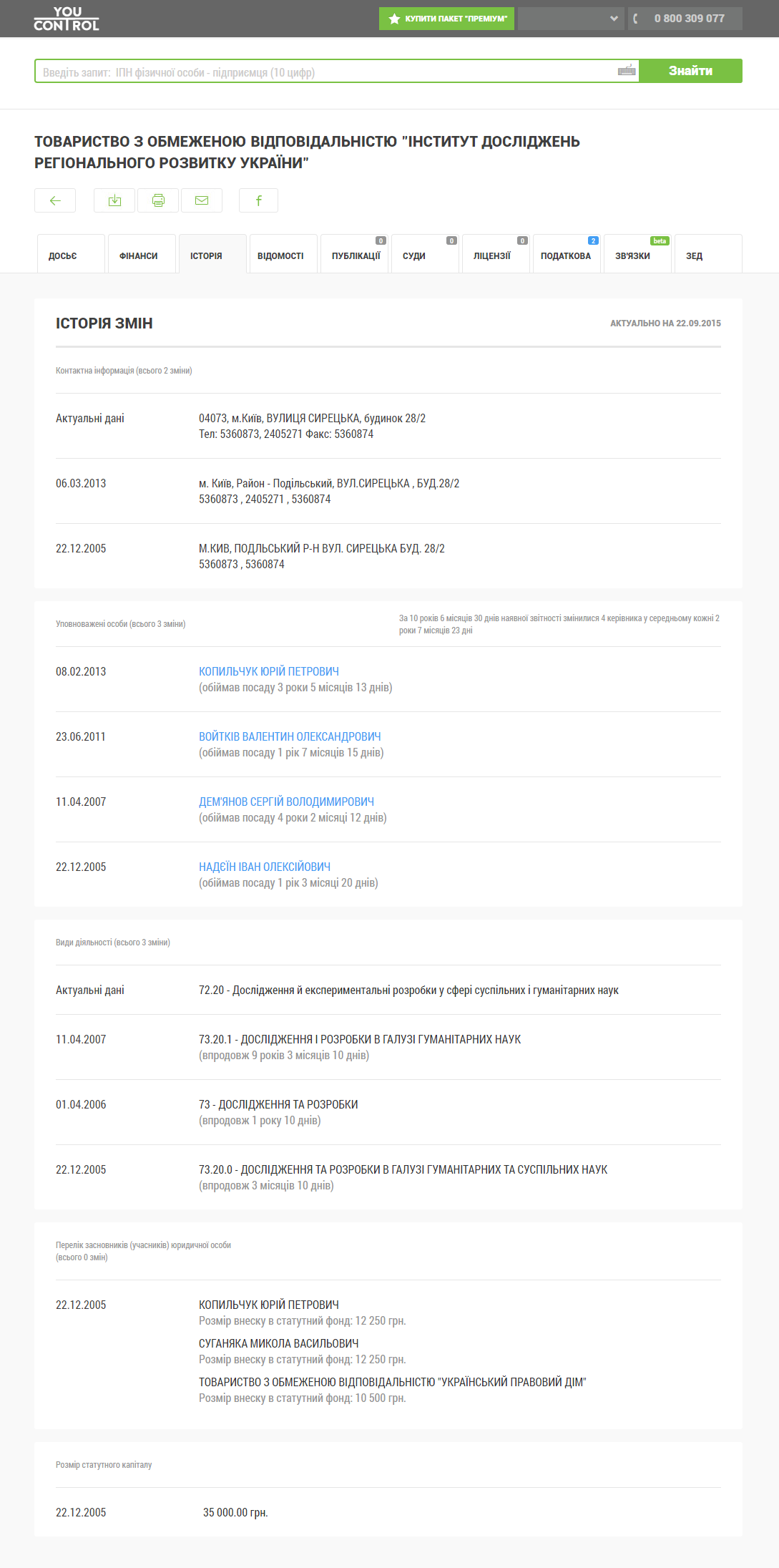 Дані єдиного державного реєстру юридичних осіб, фізичних осіб-підприємців та громадських формувань станом на 2016 рік: Дата реєстрації — 20.12.2005. Засновники — Микола Суганяка, Юрій Копильчук та ТОВ «Український правовий дім»; кінцеві бенефіціарні власники — Іван Надєїн та Ольга Надєїна, керівники — Юрій Копильчук та Валентин Войтків.