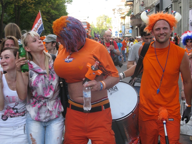 Хлопці та дівчата у помаранчевих футболках, із символікою голландської збірної заспівали "Ще не вмерла України..." у супроводі труби, а тоді продовжили ходу містом, вигукуючи "Україна! Україна!".